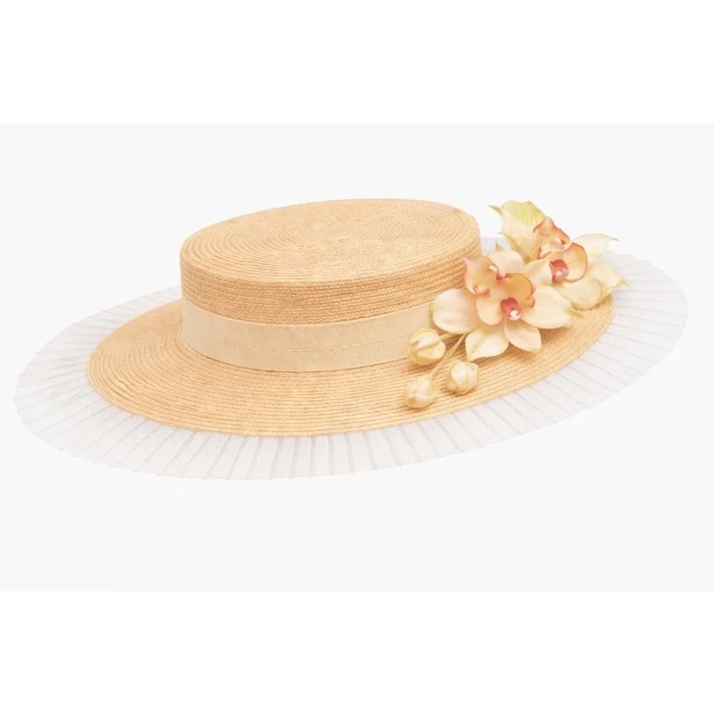 Spring/Summer › Orchid Boater Image 1 of 1 Orchid Boater £550.00 Lovely feminine boater wirh a spray of handmade silk orchids, made in any colour Add To Cart Added! Lovely feminine boater wirh a spray of handmade silk orchids, made in any colour